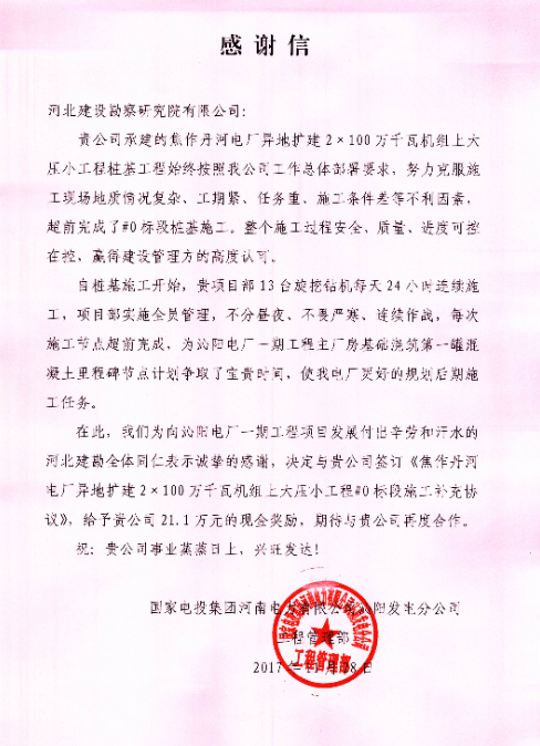 我公司承建的焦作丹河電廠異地?cái)U(kuò)建2×100萬(wàn)千瓦機(jī)組上大壓小工程樁基工程,始終按照業(yè)主工作總體部署要求,努力克服施工現(xiàn)場(chǎng)地質(zhì)情況復(fù)雜、工期緊、任務(wù)重、施工條件差等不利因素,超前完成了#0標(biāo)段樁基施工,整個(gè)施工過(guò)程安全、質(zhì)量、進(jìn)度可控在控,贏得了建設(shè)管理方的高度認(rèn)可。11月28日,國(guó)家電投集團(tuán)河南電力有限公司沁陽(yáng)發(fā)電分公司工程管理部發(fā)來(lái)感謝信,對(duì)我公司項(xiàng)目部員工表示感謝,并期待與我公司的再度合作。