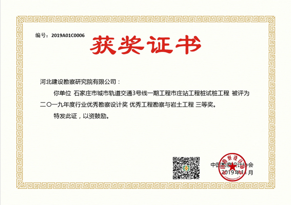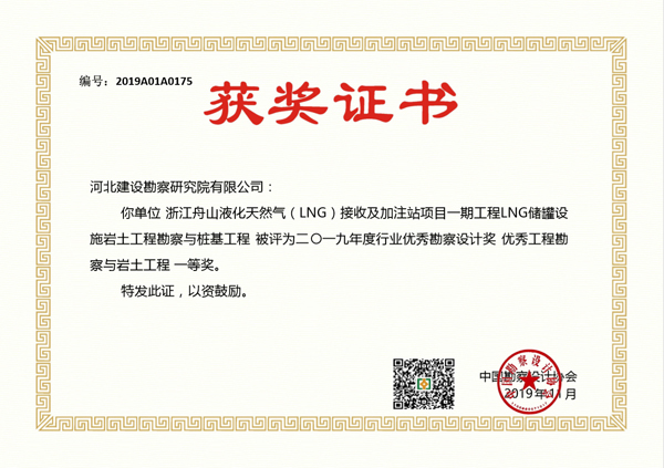 根據中國勘察設計協會下發的文件《關于公布2019年度工程勘察、建筑設計行業和市政公用工程優秀勘察設計獎評選結果的通知 》(中設協字[2019]136號),經專家評審、中國勘察設計協會網站公示和中國勘察設計協會獎勵委員會審定,公司申報的項目“浙江舟山液化天然氣(LNG)接收及加注站項目一期工程LNG儲罐設施巖土工程勘察與樁基工程”榮獲2019年度國家行業優秀勘察設計獎一等獎、“石家莊市城市軌道交通3號線一期工程市莊站工程樁試樁工程”榮獲該獎項三等獎。此次獲獎必將激勵我公司專業技術人員繼續發揚刻苦創新精神,用心做出精品工程,為公司增光添彩!