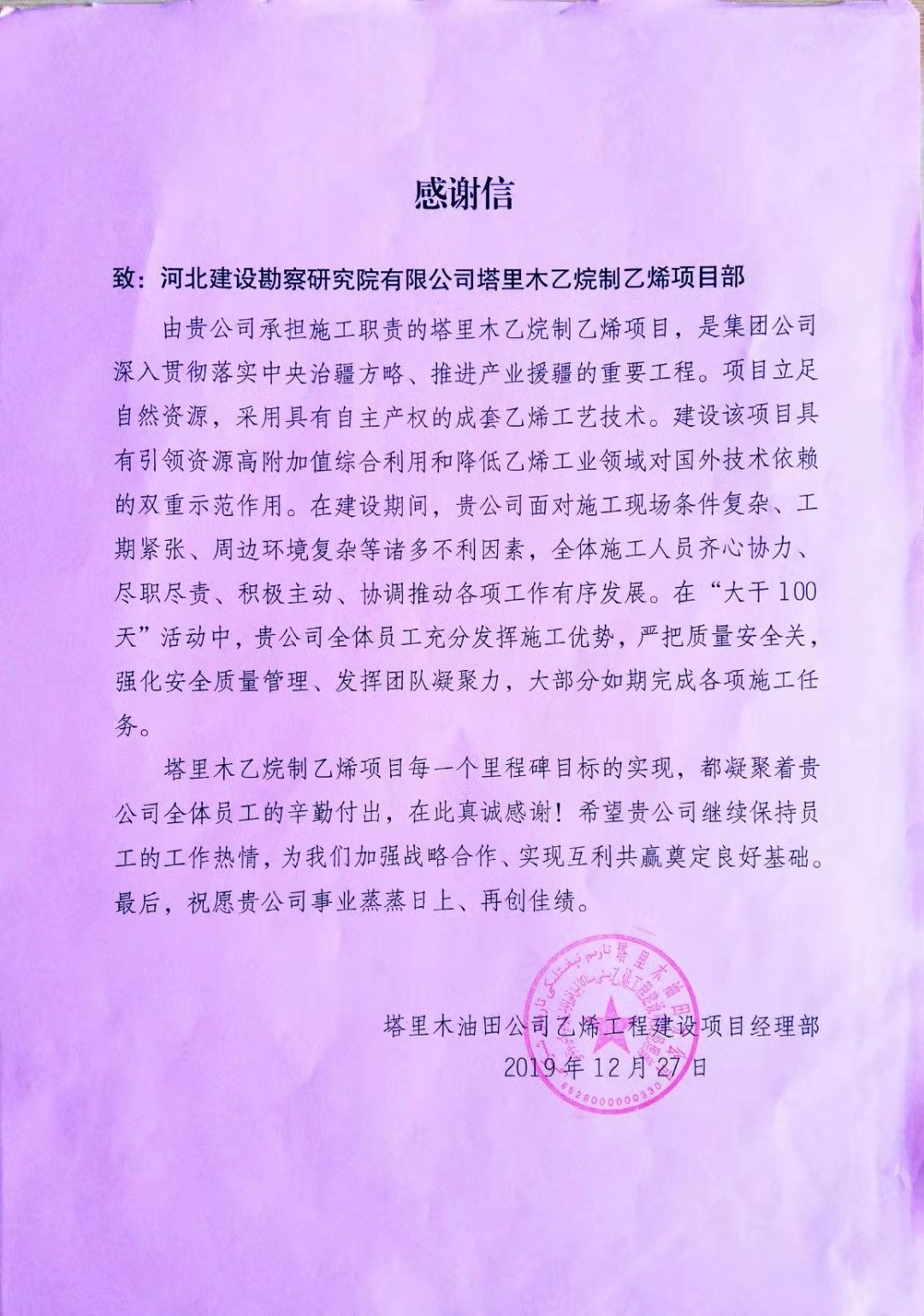 公司近日收到業(yè)主塔里木油田公司乙烯工程建設(shè)項目經(jīng)理部的感謝信及中國寰球工程有限公司北京分公司的質(zhì)量管理先進集體錦旗。在建設(shè)期間,我公司面對現(xiàn)場條件復雜、工期緊張等諸多不利因素,全體施工人員齊心協(xié)力、盡職盡責、積極主動、協(xié)調(diào)推動各工作有序開展,在施工中,嚴把質(zhì)量安全觀、強化安全質(zhì)量管理、發(fā)揮團隊凝聚力,很好的完成了各項施工任務,為雙方進一步加強戰(zhàn)略合作、實現(xiàn)互利共贏奠定了良好基礎(chǔ)。
