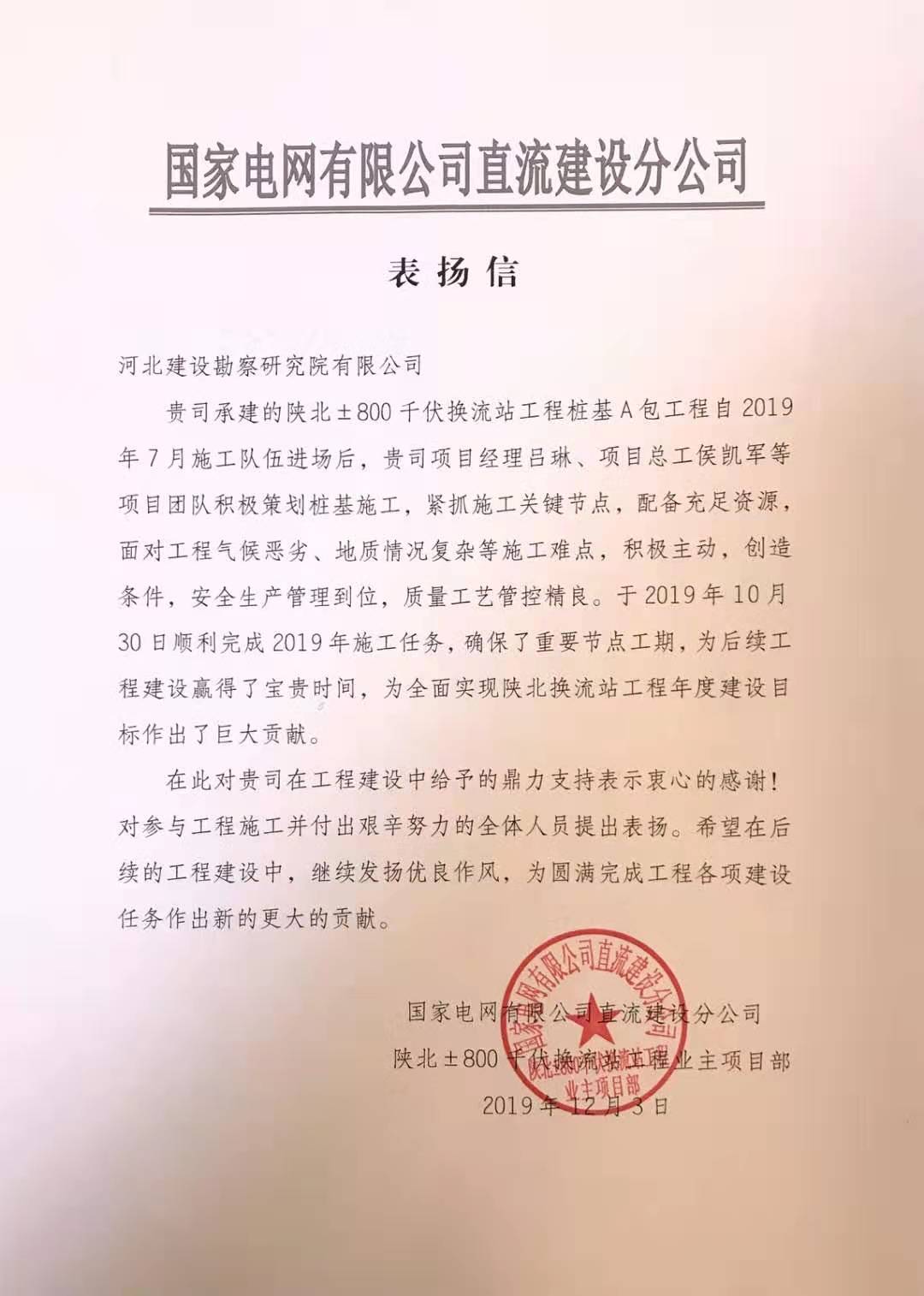 另有陜北換流站項目部也收到國家電網(wǎng)直流建設(shè)分公司的感謝信,該項目自2019年7月進場后,在項目經(jīng)理呂琳、項目總工侯凱軍等精心組織和艱苦努力下,順利完成施工任務,確保了重要節(jié)點工期,為后續(xù)工程建設(shè)贏得了寶貴時間,為全面實現(xiàn)陜北換流站工程年度建設(shè)目標作出巨大貢獻,受到業(yè)主的充分肯定和高度表揚。