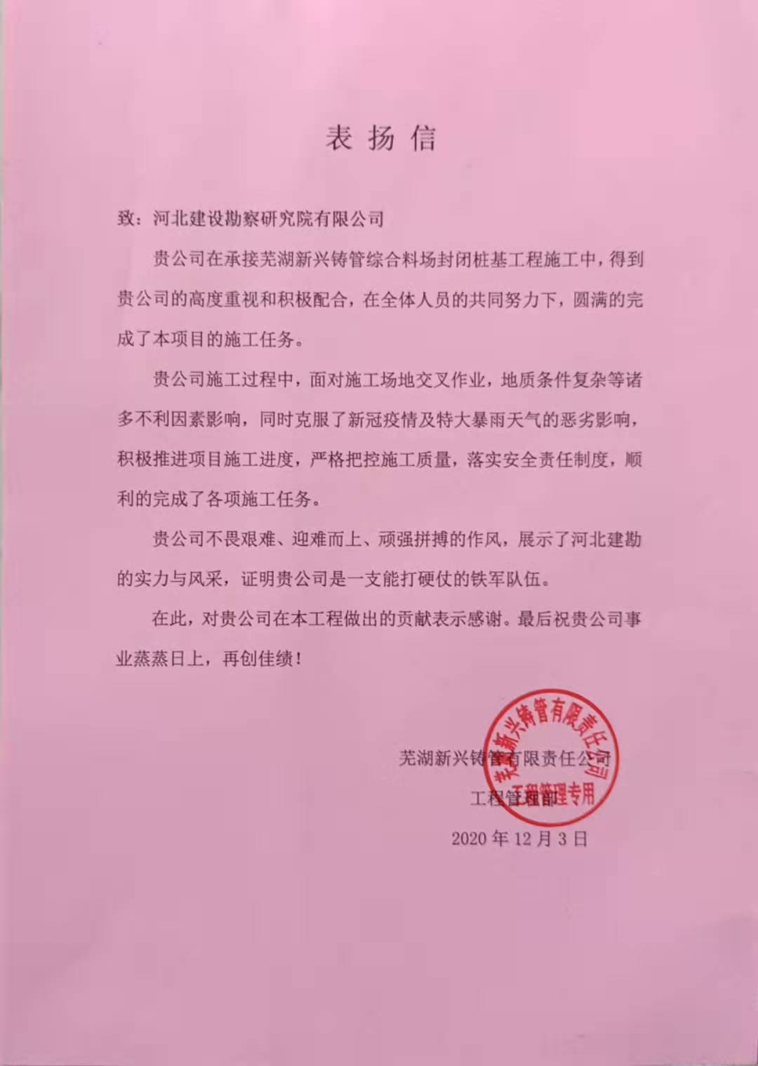 近日,公司收到蕪湖新興鑄管有限責任公司發(fā)來的表揚信,對我公司在蕪湖新興鑄管綜合料場封閉樁基施工過程中,面對施工場地交叉作業(yè),地質條件復雜等諸多不利因素,同時克服了新冠疫情及特大暴雨天氣的惡劣影響,順利完成了各項施工任務,給予了充分的肯定,并表示感謝!
