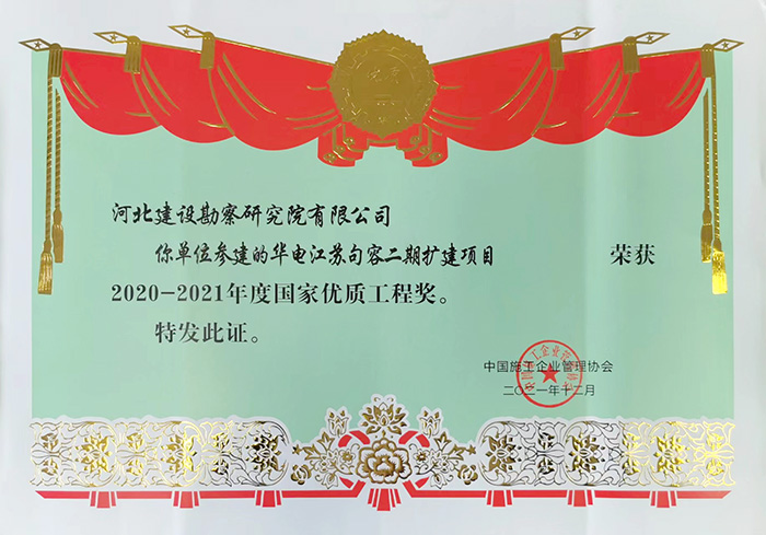 我公司參建的華電江蘇句容二期擴建項目榮獲2020—2021年度國家優(yōu)質工程獎。
