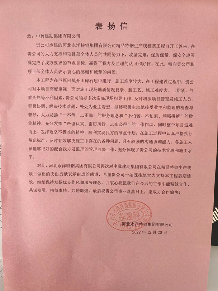 河北永洋特鋼集團有限公司精品特鋼生產線樁基工程自開工以來,在項目部全體人員的共同努力下,攻堅克難,保質保量保安全地圓滿完成了業主要求的節點目標,大力發揚“一不等、二不靠”的服務理念和“不怕苦、不怕累、頑強拼搏”的敬業精神,贏得了業主及監理的認可和好評。