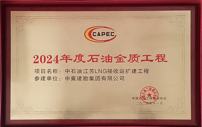 近日,集團公司收到中國石油工程建設協會頒發的獎牌,由二公司參建的中石油江蘇LNG接收站擴建工程項目喜獲“2024年度石油金質工程”。